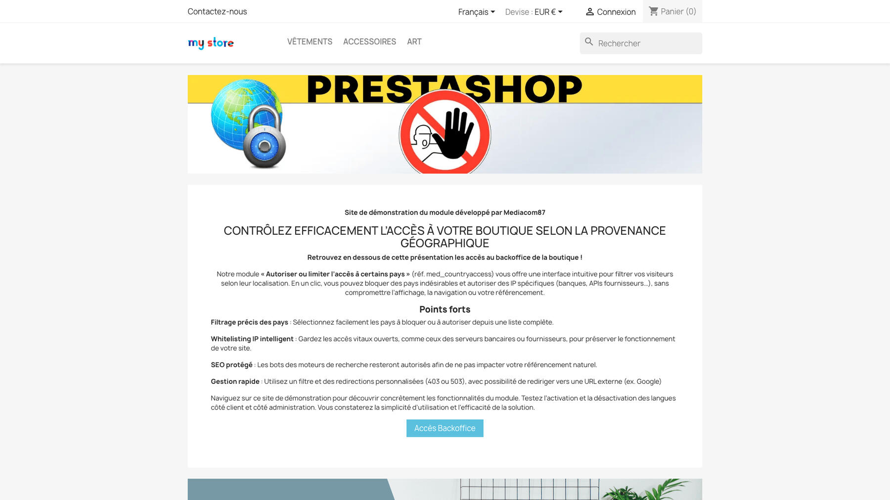 En mettant en œuvre ce module, vous pouvez contrôler efficacement l'accès à votre boutique en ligne, garantissant ainsi à vos clients une expérience d'achat sécurisée et efficace.